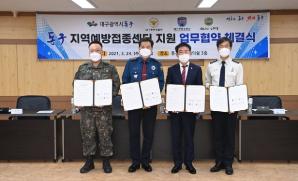 대구 동구청(구청장 배기철)과 대구동부경찰서(서장 류영만), 대구동부소방서(서장 김기태), 육군 제8251-2부대(부대장 전성근)는 24일 동구청에서 ‘동구지역 코로나19 예방접종센터 지원 업무협약(MOU)’을 체결했다.