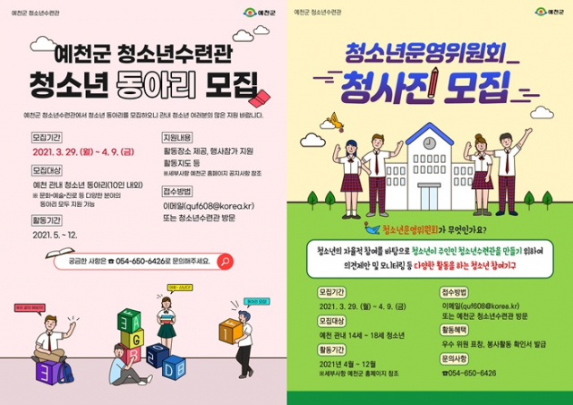 예천군 청소년수련관이 3월 29일부터 4월 9일까지 청소년동아리와 14기 청소년운영위원회 ‘청‧사‧진(청소년의 사랑과 우정을 함께하는 진실된 모임)’ 위원을 모집한다.