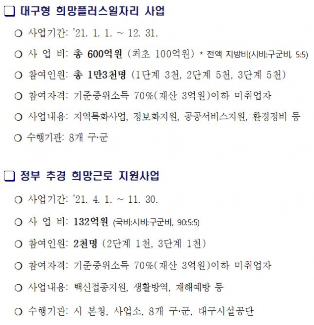 다음으로 정부 추경에 따른 ‘희망근로 지원사업’은 코로나19 백신접종 지원과 생활방역 등에 중점을 두고 시행한다. 2단계 사업의 근무기간은 5월 6일부터 7월 23일까지이다. 단, 백신접종 지원인력은 6개월간 근무한다. 신청대상, 모집시기와 접수처는 대구형 희망플러스일자리사업과 같고, 모집규모는 2·3단계 각 1천명이다.