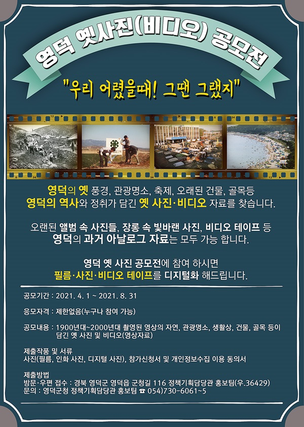 영덕군은 1일부터 8월31일까지 영덕 옛사진(비디오) 공모전 ‘우리 어렸을때! 그땐 그랬지’를 진행한다고 4월 2일 밝혔다.