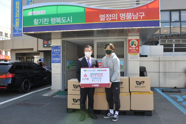 이날 전달된 티셔츠와 마스크는 대구 사회복지공동모금회를 통해 아동양육시설 및 생활이 어려운 남구 저소득 세대 등에 전달될 예정이다.