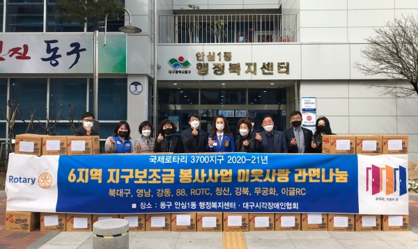 국제로타리3700지구 제6지역 로타리클럽(지역대표 양은주)은 안심1동행정복지센터 및 대구시각장애인협회를 방문해 저소득 세대에 지원해 달라며 라면 156박스(250만 원 상당)를 전달했다고 1일 밝혔다.