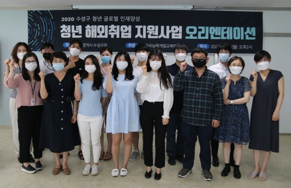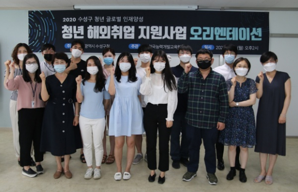| ↑↑ 2020년 6월 15일 한국능력개발교육원에서 수성구 청년 해외취업 지원 사업 참여자들이 오리엔테이션을 가진 후 기념촬영하고 있다. |