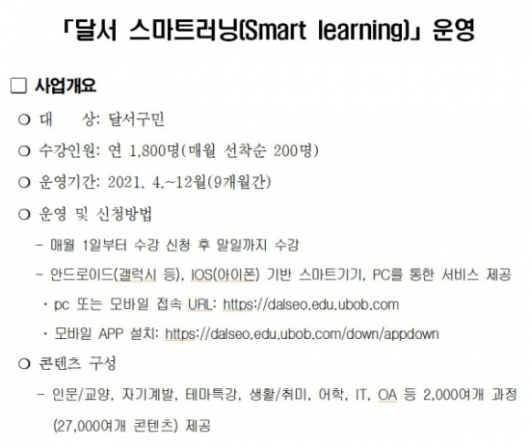‘달서 스마트러닝’은 달서구에서 다양한 온라인 교육콘텐츠 제공을 통해 지역 평생교육의 접근성 확대와 코로나19로 증가하는 언택트 평생학습 수요층에 적극 대응하기 위해 금년부터 신규 시행한다.