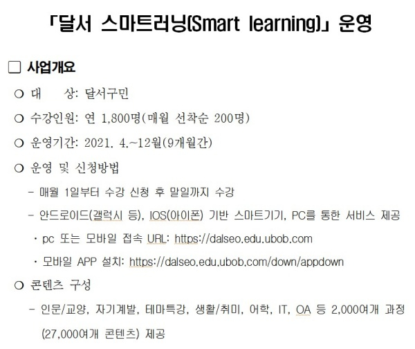 매월 1일 수강신청을 통해 주민 200명을 선착순 모집하여 한 달간 교육 콘텐츠를 제공하며, 모바일 어플리케이션(안드로이드, IOS), PC(https://dalseo.edu.ubob.com) 등을 통해 자유로운 수강이 가능하다.