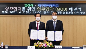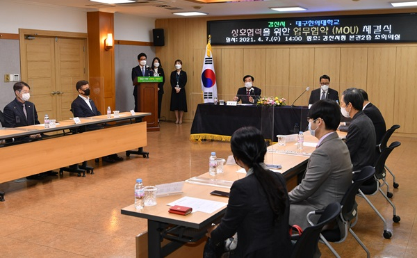 경산시(시장 최영조)는 4월 7일 대구한의대학교(총장 변창훈)과 함께 지역사회 인적자원의 공동활용과 창의적 협업시스템을 위한 상호업무협약(MOU)체결을 하였다.