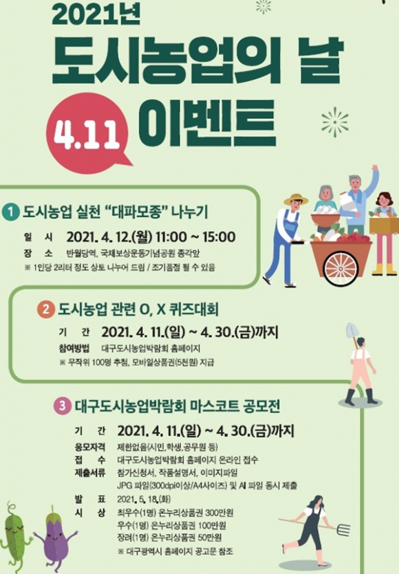 대구시는 ‘4.11, 도시농업의 날’을 맞아 대파모종 나누기, 도시농업 OX퀴즈, 도시농업박람회 마스코트 공모전 등 다양한 이벤트를 개최해 도시민들의 도시농업 실천을 장려한다.