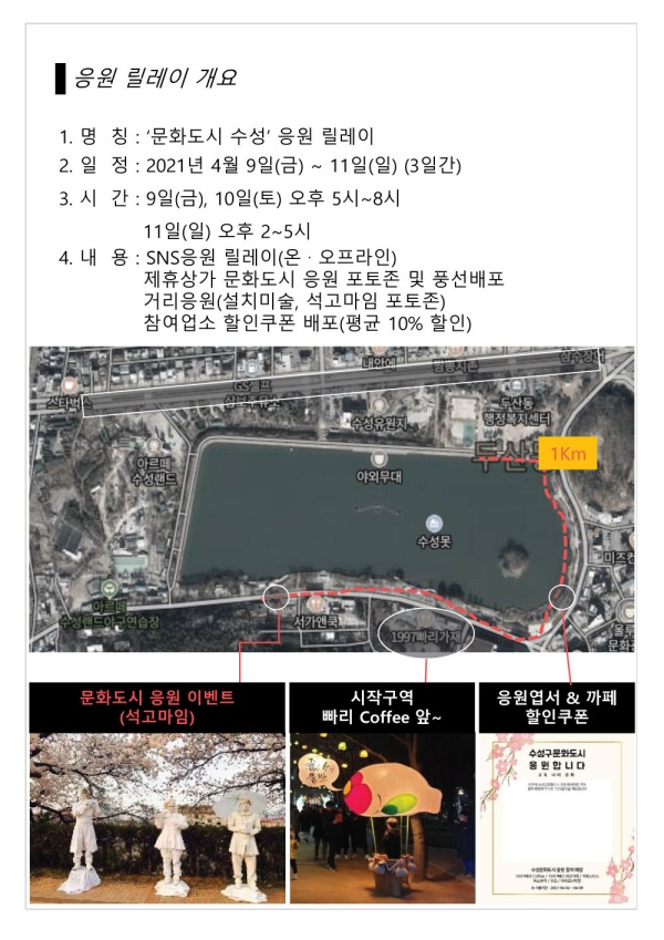 릴레이에 참여하는 6개의 카페와 식당은 포토존을 설치하고, 시민들에게는 할인쿠폰을 제공한다. 또한, 수성못 상생협의체에 속한 예술인들의 거리 응원과 풍선 응원 등이 펼쳐진다. 모든 행사는 코로나19 방역 지침을 준수하며 진행된다.
