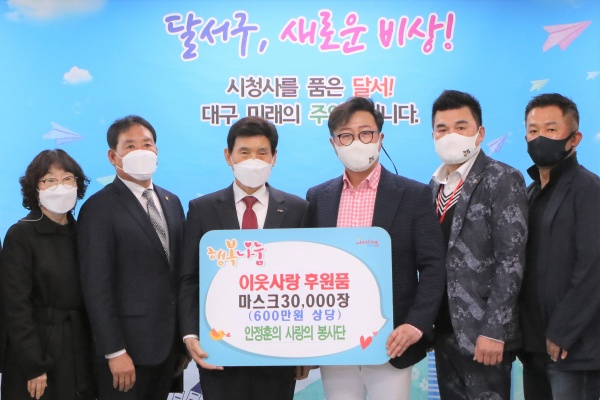 대구 달서구(구청장 이태훈)는 안정훈의 사랑의봉사단(단장 안정훈)이 지난 5일 덴탈마스크 3만 장(600만 원 상당)을 전달했다고 밝혔다.
