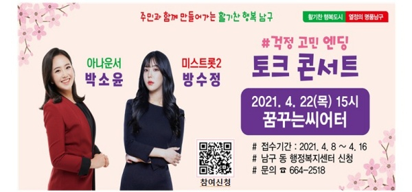 남구청은 오는 16일까지 방청권을 신청을 받아 『걱정 고민 엔딩』 토크 콘서트를 개최할 예정이라고 밝혔다.