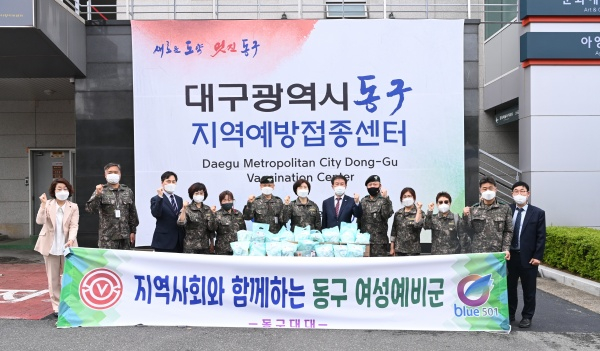 대구 동구청(구청장 배기철)은 지난 13일 동구 여성예비군소대(소대장 우임순)가 아양아트센터에 설치된 동구예방접종센터를 방문하여 코로나19 백신접종으로 고생하고 있는 의료진과 자원봉사자를 격려하고 과일, 떡, 음료 등 간식 80개(50만 원 상당)를 전달했다고 밝혔다.