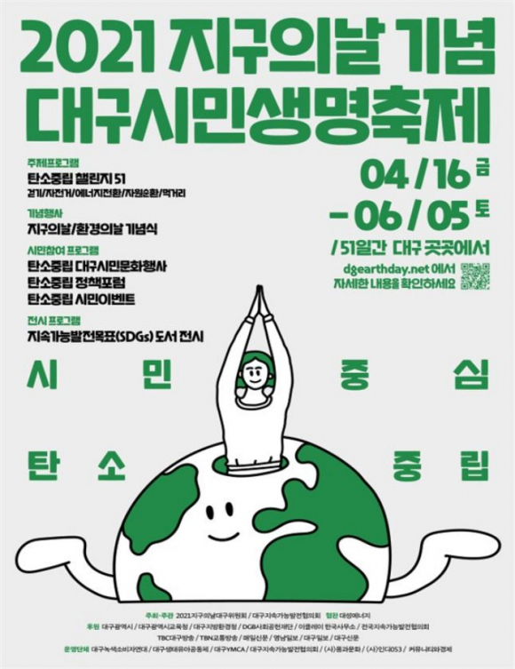 대구시는 대구지속가능발전협의회(회장 정현수)와 2021지구의날대구위원회가 공동 주관하는 2021 지구의 날 기념 ‘대구시민생명축제’를 지역의 100여 개 기관․단체 및 시민과 함께 On-Line과 Off-Line 방식으로 51일간(4. 16.~6. 5.)의 여정으로 대구시 전역에서 개최한다.