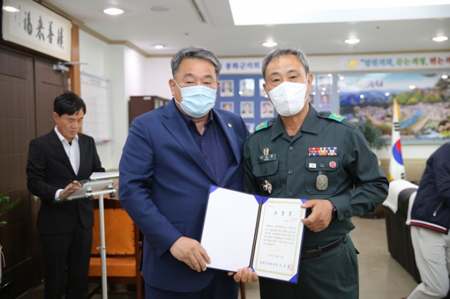 봉화군의회(의장 권영준)는 제53주년을 맞는 예비군의 날을 기념하여 지난 4월 14일 군 의장실에서 안승춘 춘양면대장 등 3명에게 모범 예비군지휘관에 표창을 수여했다고 밝혔다.