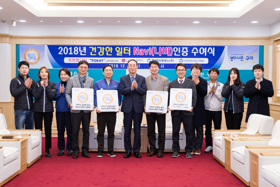 올해 ‘건강한 일터’로 재인증된 곳은 LG디스플레이(주), 도레이첨단소재(주), 효성티앤씨(주) 3곳이며, 효성티앤에스(주)가 새롭게 인증되었다.