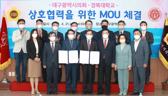 대구광역시의회 장상수 의장이 4월 21일(수) 오후 2시 대구시의회 간담회장에서 시의회와 경북대학교 간 지역사회 발전과 시민행복을 위한 정책개발에 상호협력을 약속하는 MOU(업무협약) 체결식을 진행했다.