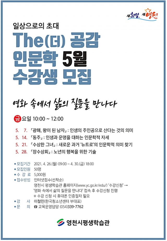 최기문 영천시장은 “The(더) 공감 인문학은 다양한 분야와 매개체를 통해 인간이란 존재의 특성을 이해하는 강좌로, 급변하는 사회변화 속에서 마음의 중심을 찾기가 더욱 힘든 지금 나와 주변, 사회를 폭넓게 이해하는 배움의 시간이 되길 바란다”고 말했다.