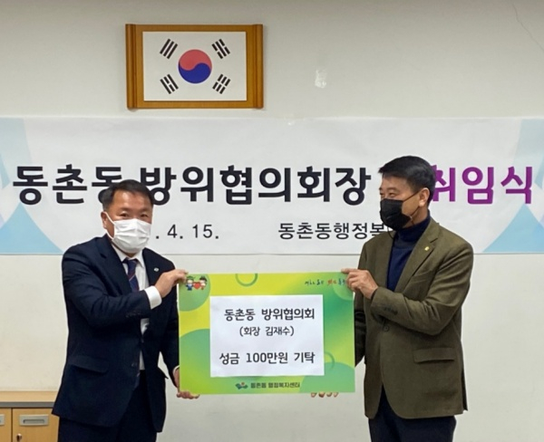 | ↑↑ 동촌동 방위협의회(회장 김재수)에서 동촌동 민간사회안전망위원회에 성금 100만 원을 기탁했다 |