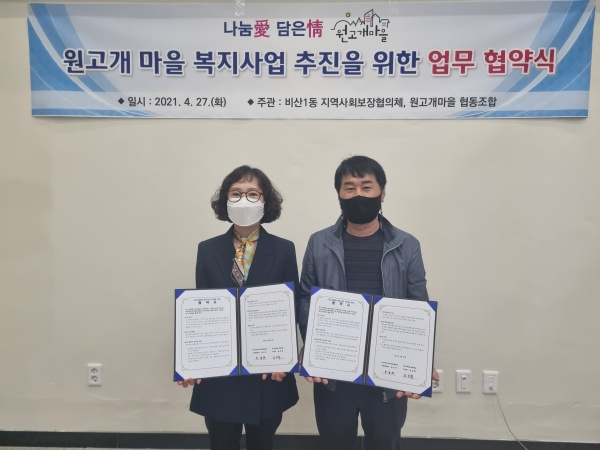 대구 서구 비산1동 지역사회보장협의체는 원고개마을 복지사업의 원활한 추진을 위해 원고개마을 협동조합(이사장 김진동)과 2021년 4월 27일 업무협약(MOU)을 체결했다.