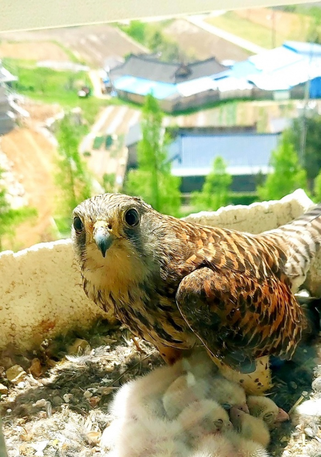 천연기념물 제323호 황조롱이가 경주시 도지동 한 아파트 베란다 화분에 둥지를 틀고 새끼 5마리를 부화시켜 놀라움을 자아내고 있다.