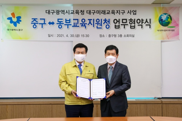 대구 중구(구청장 류규하)는 지난 30일 구청 소회의실에서 동부교육지원청(교육장 박종환)과 『지역 교육 발전 및 상호 협력을 위한 업무협약』을 체결하였다. 이날 중구에서는 류규하 중구청장이, 동부교육지원청에서는 박종환 교육장이 참석했으며, 양 기관은 함께 협약서에 서명하고 기념 촬영을 하면서 향후 긴밀한 협력을 약속했다.