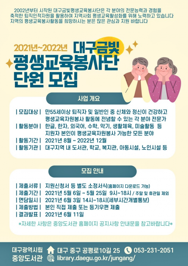 대구중앙도서관(관장 장철수) 대구지역평생교육정보센터는 지역사회 평생교육기관 자원봉사활동에 참여할‘2021년도 대구금빛평생교육봉사단’을 5월 6일(목) 오전 9시부터 5월 25일(화) 오후 6시까지 모집한다.