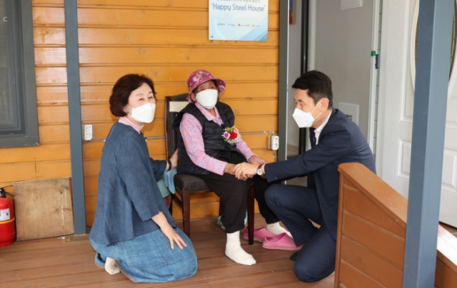 | ↑↑ 일본군 위안부 할머니 댁을 방문해 이야기를 나누고 있는 이강덕 포항시장과 부인 최혜련 여사 |