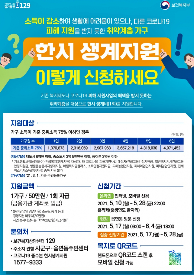 한시 생계지원은 2019년 또는 2020년보다 올해 1~5월 동안의 소득이 감소하고, 소득이 기준중위소득 75%이하(4인 가구 365만원)면서, 재산은 3억 5천만원이하일 경우 지원이 가능하다.