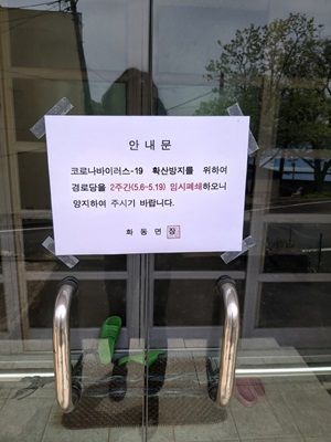 한편, 화동면행정복지센터(면장 서해욱)에서도 관내 19개 경로당에 대해 2주간(5.6~5.19) 자체적으로 임시폐쇄 조치를 내렸다.