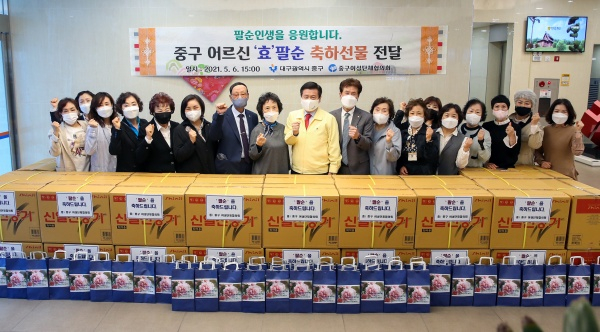 대구광역시 중구 여성단체협의회(회장 김경희)는 5월 6일 중구청 1층 로비에서 5월 가정의 달을 맞이하여 올해로 팔순이 되는 관내 어르신 70명에게 ‘효’ 팔순 축하선물인 선풍기와 간식꾸러미를 전달하였다.