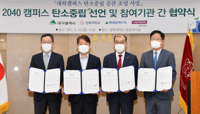 대구시는 ‘탄소중립 선도도시 조성’을 위해 경북대학교에서 올해 4월 23일 제안한 전국 최초 ‘대학 캠퍼스 탄소중립 공간 조성’ 사업의 성공적인 수행을 위하여 대구시와 경북대, 현대일렉트릭, 태영건설이 참여하는 업무협약을 5월 10일(월) 오후 2시에 경북대에서 체결했다.