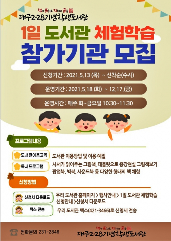 대구2‧28기념학생도서관(관장 배호기)은 유아들이 어릴 때부터 책과 친해질 수 있도록 대구동부교육지원청 관내(동구, 중구, 수성구) 유치원 112개원과 어린이집 402개소을 대상으로‘1일 도서관 체험학습’프로그램을 마련해, 참가를 희망하는 기관을 5월 13일(목)부터 수시 모집한다.