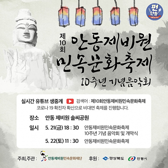 (사)안동제비원민속문화재단(이사장 권순협)은 「2021년 제10회 안동제비원민속문화축제」를 5월 21일(금)부터 22일(토)까지 제비원 솔씨공원에서 코로나19 확산방지를 위한 무관중 공연으로 개최한다.