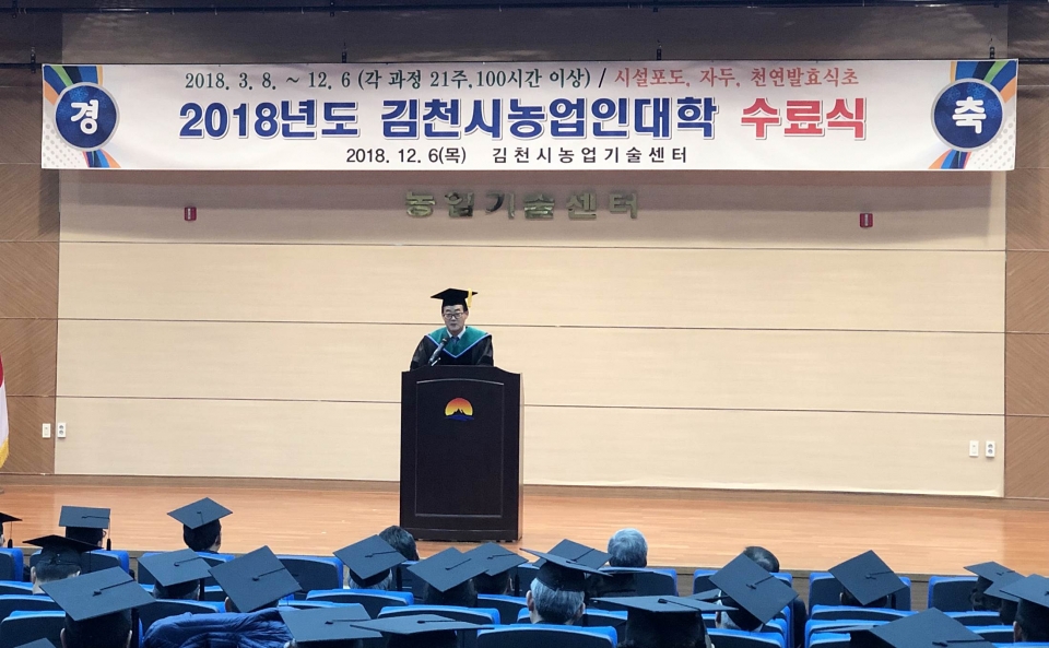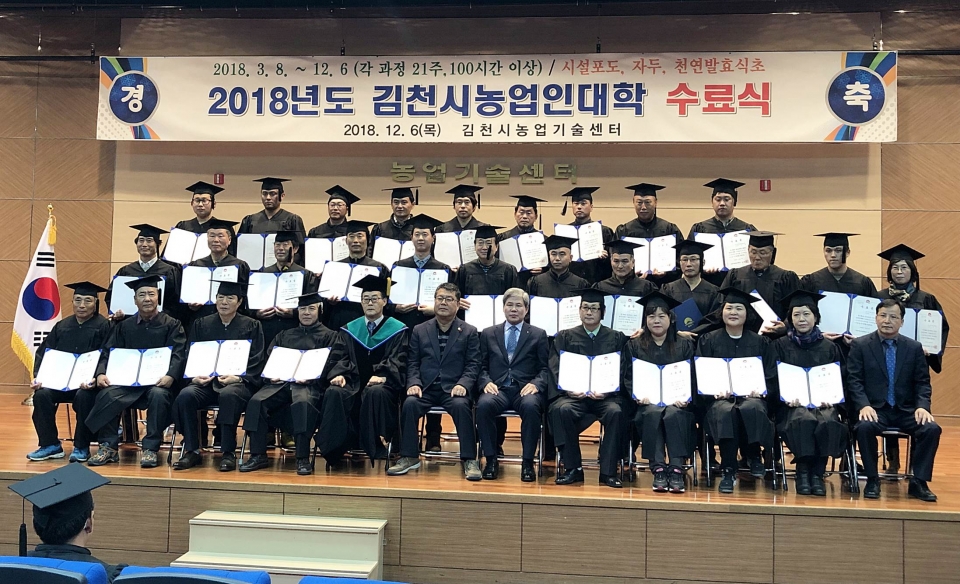 김천시(시장 김충섭)는 지역 농업발전에 필요한 품목별 장기 핵심교육으로 과학영농 실천능력을 갖춘 전문 농업경영인 양성을 위해 개설된 제10기 김천시농업인대학 수료식을 지난 6일 김천시 농업기술센터에서 성황리에 개최했다고 밝혔다.