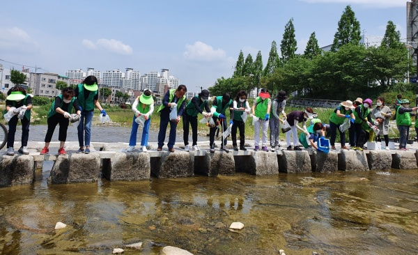 (사)자연보호대구광역시북구협의회(회장 이승호)는 5월 14일(금) 팔거천 생태계 환경보전을 위하여 회원 40여 명과 함께 코로나19 방역수칙을 철저히 준수하며 팔거천에서 미꾸라지와 다슬기를 방사하고 하천 정화활동도 실시하였다.