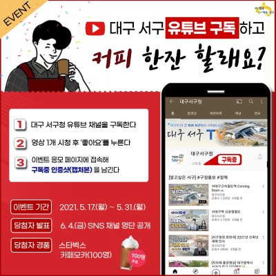 당첨자는 6월 4일 대구서구청 각 SNS 채널을 통해 발표되며, 참여자 중 100명을 추첨해 모바일 커피 쿠폰을 제공할 예정이다.