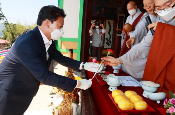 이병환 성주군수가 ‘불기2565년 부처님오신날’을 맞이하여 성주읍 관운사를 시작으로 선남면 대흥사까지 4개소를 방문하였으며, 방문하지 못한 사찰에는 축하메시지와 함께 손소독제 및 마스크 등의 방역 물품을 배부하였다.