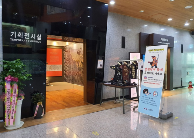 <견훤왕과 함께 후백제로 떠나요> 포토존은 만 4세 ~ 만 12세 아이들이 견훤이 살았던 후백제 시대 갑옷을 입고 전시를 관람할 수 있도록 기획전시실 입구에 마련되었다. 관람객은 후백제를 여행하듯 갑옷을 입고 전시를 관람하며 특별한 추억을 만들 수 있다.