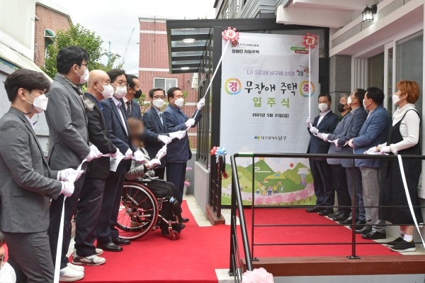 대구광역시 남구청(구청장 조재구)은 21일, 35년간 시설생활을 마감하고 전국 최초로 건립한 무장애 주택에서 지역사회 일원으로 새출발하는 신00씨와 박00씨의 입주식을 가졌다.