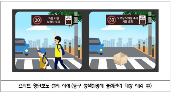 동구청은 지난 17일과 18일 양일간 정책실명제 심의위원회 심의를 거쳐 정책실명제 중점관리 대상사업으로 스마트 횡단보도 설치, 안심습지 생태공원 조성사업과 국민신청실명제 접수 2건을 포함해 총 23건을 선정했다.