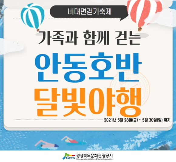 경상북도문화관광공사(사장 김성조, 이하 공사)는 오는 5월 28일부터 5월 30일까지 사흘간 안동문화관광단지와 월영교 일대를 잇는 두 번째 “비대면 걷기 축제, 가족과 함께 걷는 안동호반 달빛야행”을 개최한다고 밝혔다.