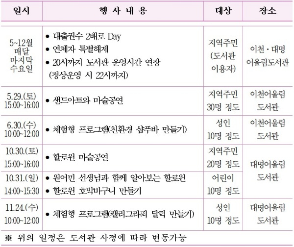 5월〜12월 중 매달 마지막주 수요일은 남구립 이천·대명어울림도서관에서 ‘대출권수 2배로 Day’, ‘연체자 특별해제’ 혜택을 누릴 수 있으며, 도서관 어린이·종합자료실을 20시까지 이용할 수 있다.