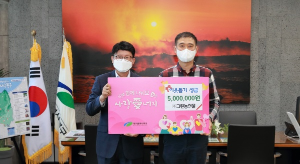 ㈜그린농산물은 매천동에 위치한 농수산물 유통 업체로, 지난해에도 성금 500만 원을 기탁하였으며, 지역민을 위해 매년 꾸준히 나눔 활동을 하고 있다.