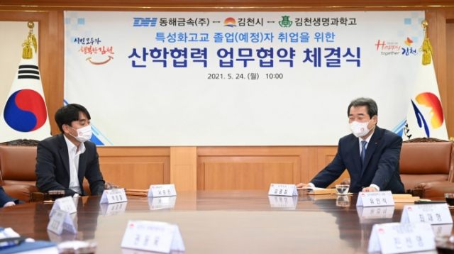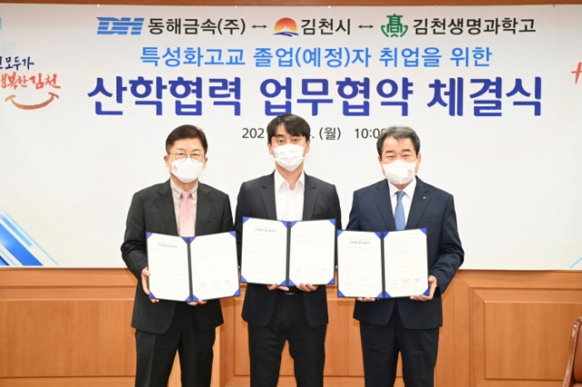 김천시(시장 김충섭)는 24일 김천시청 접견실에서 김천시장, 동해금속(주) 서호진 총괄사장, 김천생명과학고등학교 유인식 교장 등이 참석한 가운데 지역인재 채용 확대를 위한 산학협력 업무협약을 체결하였다.