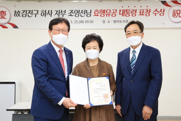 | ↑↑ 김대권 수성구청장은 지난 25일 수성구립 범어도서관에서 조영선 씨에게 ‘제49회 어버이날 기념 효행유공 정부포상’ 대통령 표창을 전수한 후 기념촬영하고 있다.(왼쪽부터 김대권 수성구청장, 조영선 씨, 김대락 씨(조영선 씨 남편)) |