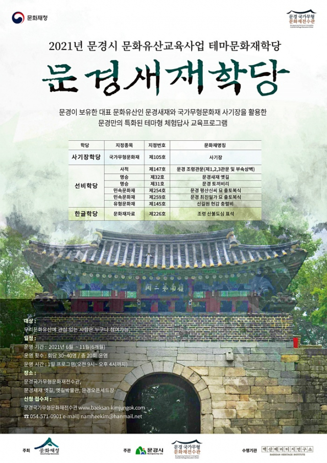 경북 문경시가 작년에 이어 문화재청의 2021년 지역문화유산교육 사업에 선정, 테마문화재 학당인 ‘문경새재학당’을 오는 6월부터 운영한다고 밝혔다. 테마문화재학당은 일정한 주제를 가지고 관련 문화재에 대한 집중적 강의, 체험 및 답사로 운영되는 테마교육 프로그램으로, 2021년에는 지자체공모를 통하여 전국 각지에서 6개 프로그램만이 선정되었다.