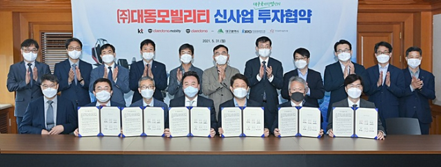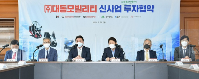 대구시는 5월 31일(월) 오전 별관 대회의실에서 권영진 대구시장, ㈜대동 원유현 총괄사장, ㈜대동모빌리티 이승원 대표이사를 비롯해 송재호 KT 부사장, 여준구 KIRO(한국로봇융합연구원) 원장, 김익재 KIST(한국과학기술연구원) AI‧로봇연구소장이 참석한 가운데 대동그룹의 e-모빌리티 신사업 투자협약(MOU)을 체결했다.