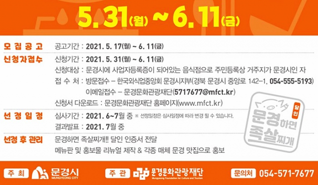 마지막으로 팁이 하나 있다면 올해 심사 시엔 족살찌개 외에 족살 부위를 이용한 다른 메뉴가 있을 시 가점을 부여할 예정이니 족살찌개 달인이 되고자 하는 자는 이번 기회를 놓치지 말자. 문의처 : 문경문화관광재단(054-571-7677)