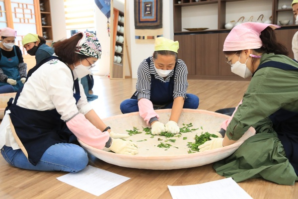 | ↑↑ ‘차 제조와 행다례’ 교육 수강생들이 지난 1일 모명재 한국전통문화체험관에서 찻잎 유념(비비기) 체험을 하며 찻잎 향을 느끼고 있다. |