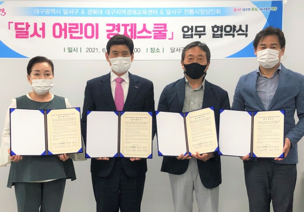 대구 달서구(구청장 이태훈)는 6월 3일 구청 회의실에서「달서 어린이 경제스쿨」운영을 위해 경북대 대구지역경제교육센터(센터장 오영수) 및 전통시장 상인회(월배시장 손병식 회장, 와룡시장 윤선주 회장)와 업무협약을 체결했다고 밝혔다.