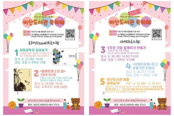 개관 5주년 기념행사로는 이예린 작가와의 만남, 신유미 작가의 그림책 콘서트, 컵케이크 만들기, 독후활동, 비산도서관 사진 퍼즐 맞추기, 연체자 구제 등 풍성한 행사가 펼쳐질 예정이다.